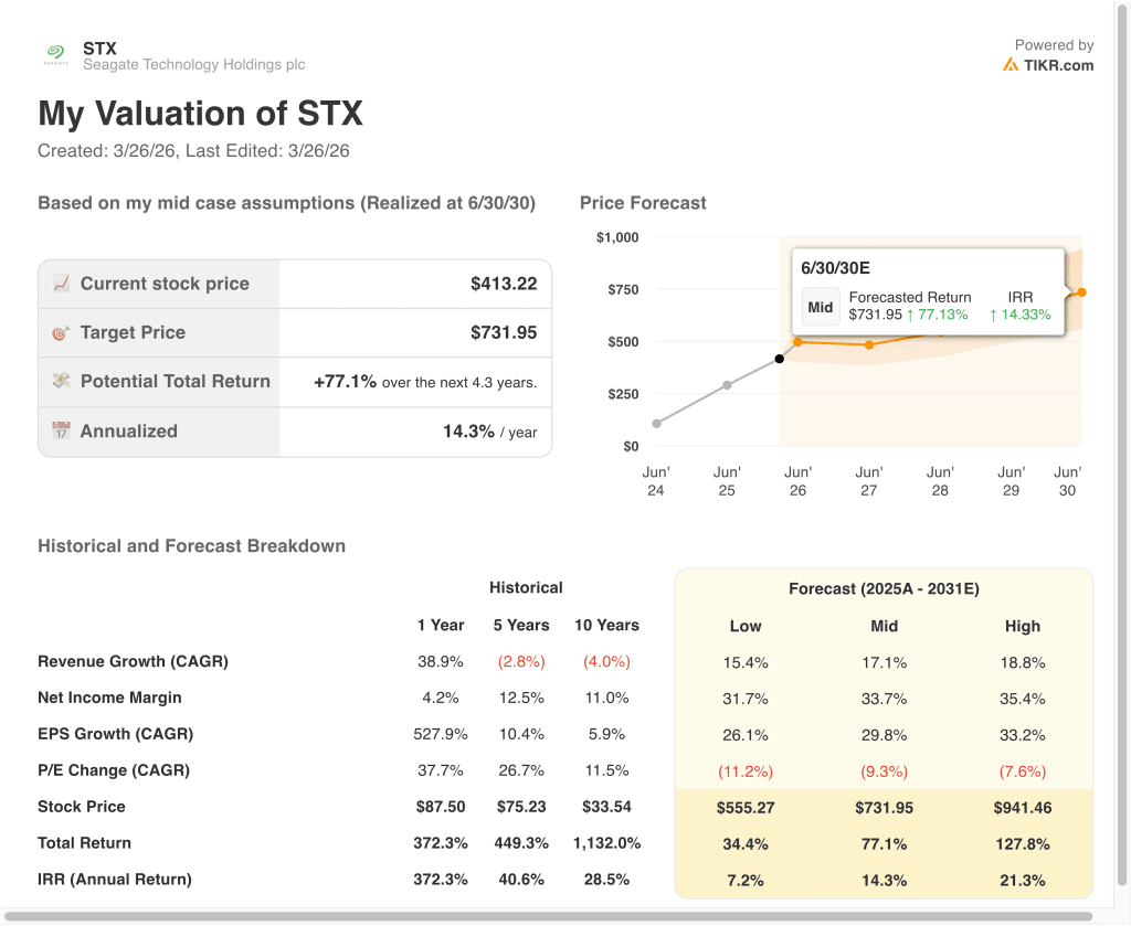 - Mid Case: AI storage demand stays strong, and Seagate sustains better pricing and profitability → 14.3% annual returns