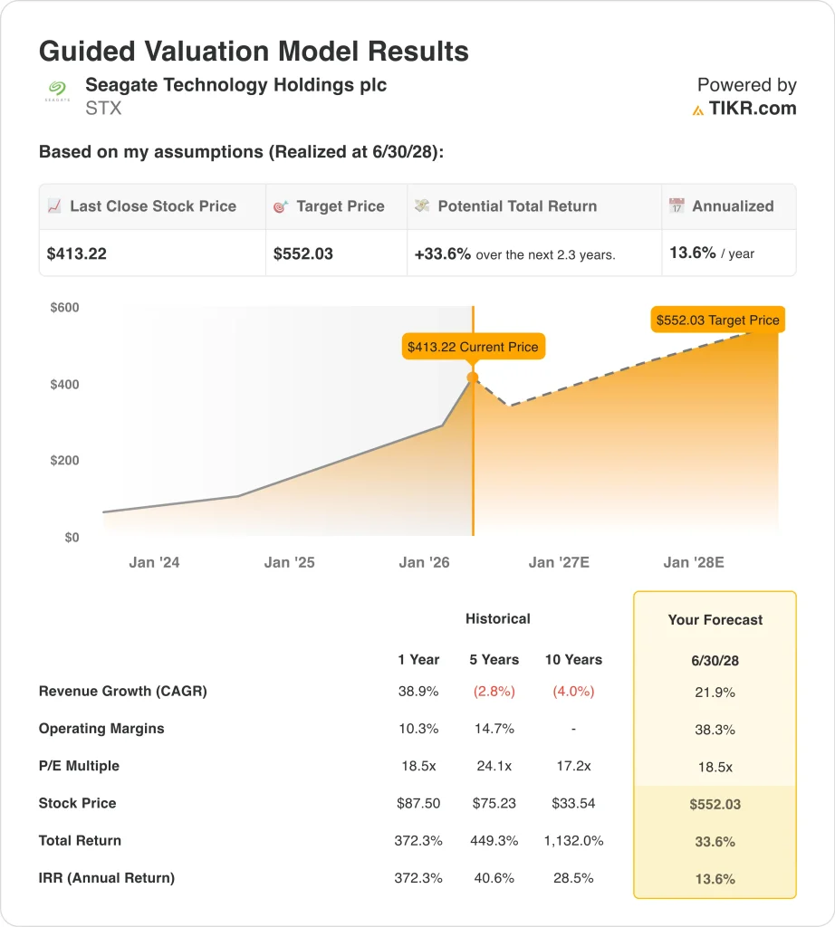 Based on estimates of 21.9% annual revenue growth, 38.3% operating margins, and a normalized P/E multiple of 18.5x, the model projects Seagate stock could rise from $413 to $552 per share by June 2028.