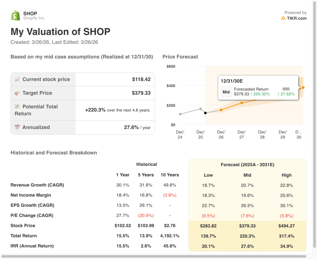 - Mid Case: Shopify compounds revenue and margins while holding a premium valuation → 27.6% annual returns
