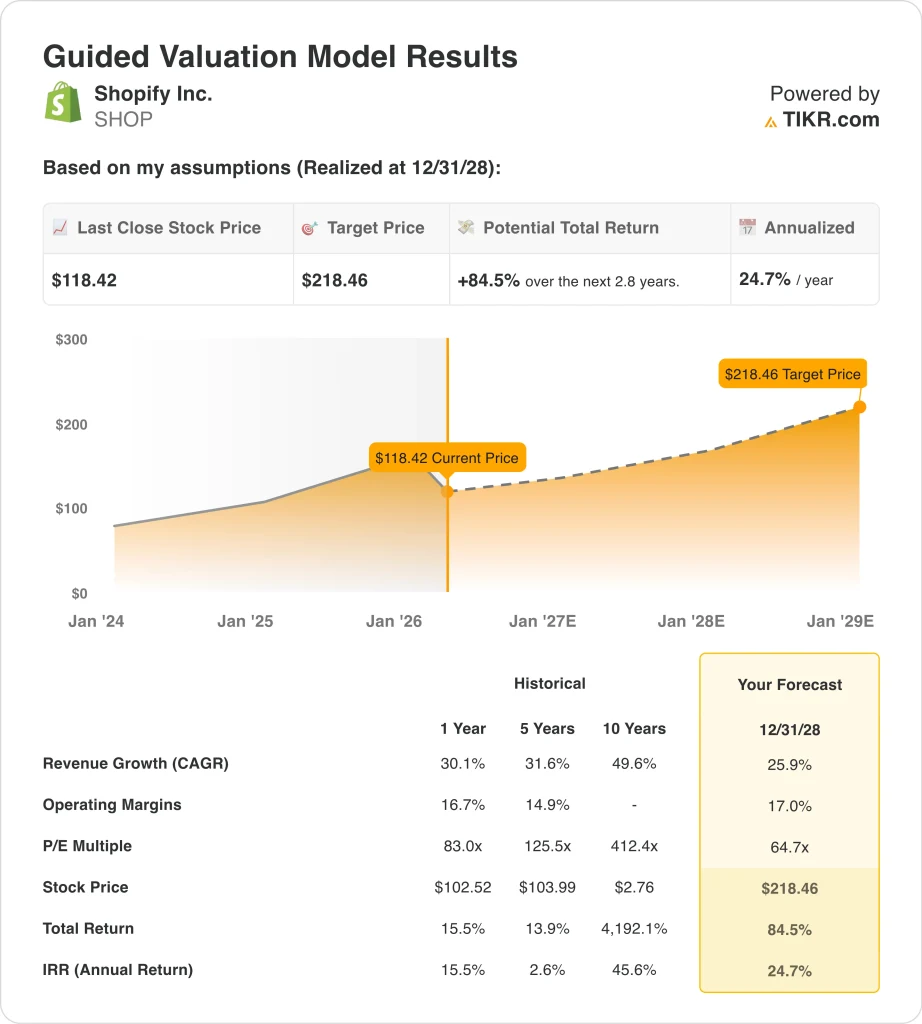 Based on estimates of 25.9% annual revenue growth, 17.0% operating margins, and a normalized P/E multiple of 64.7x, the model projects Shopify stock could rise from $118 to $218 per share by December 2028.