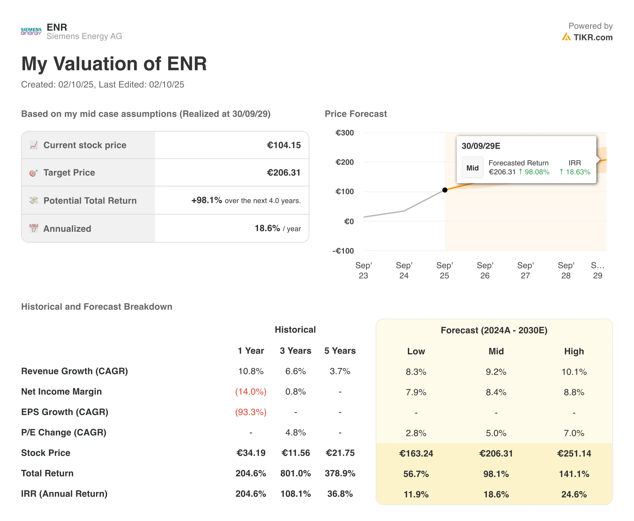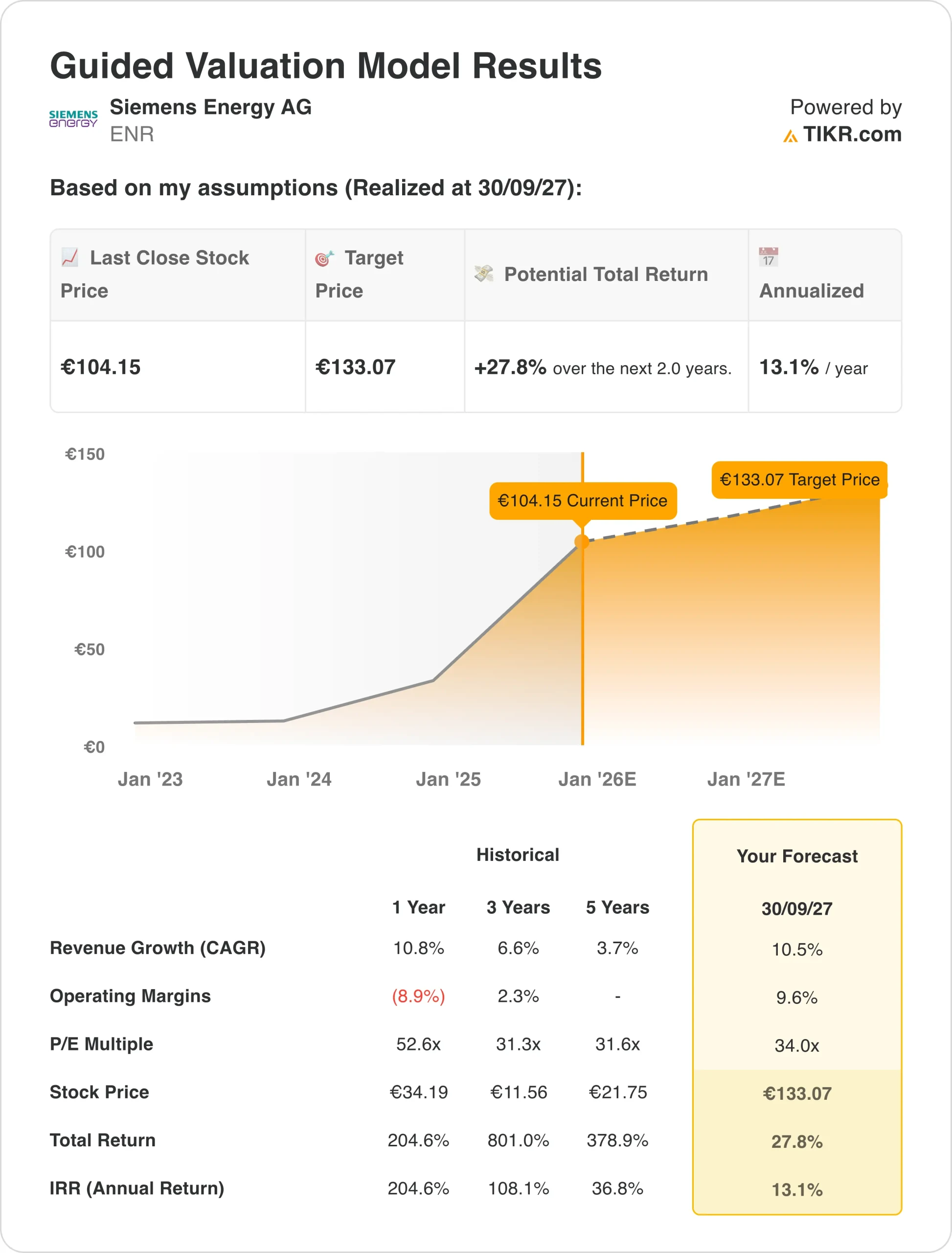 Based on estimates of 9% annual revenue growth, 9.6% operating margins, and a normalized P/E valuation multiple of 34x, the model projects Siemens Energy stock could rise from €104/share to €133/share.