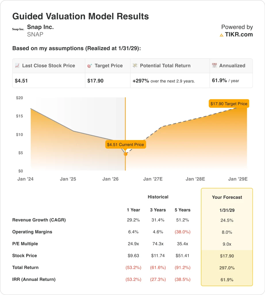 Value your favorite stocks like SNAP with 5 years of analysts’ forecasts using TIKR’s new Valuation Model (It’s free) >>>