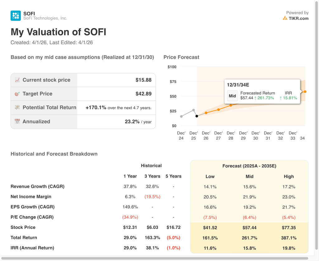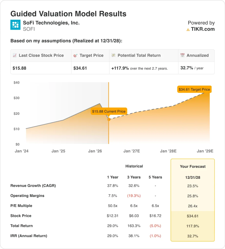 Based on estimates of 23.5% annual revenue growth, 25.8% operating margins, and a normalized P/E multiple of 26.4x, the model projects SoFi stock could rise from $15.88 to $34.61 per share.