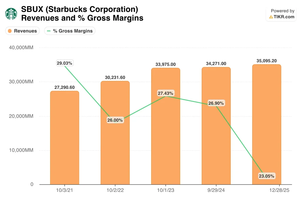 Those assumptions are grounded in a business that is still profitable, but less efficient than it used to be. LTM revenue was $37.7 billion, but gross margin fell to 22.2%, and EBIT margin fell to 9.4%. That matters because Starbucks is spending more on labor, store operations, and restructuring while also dealing with elevated coffee costs and tariffs.