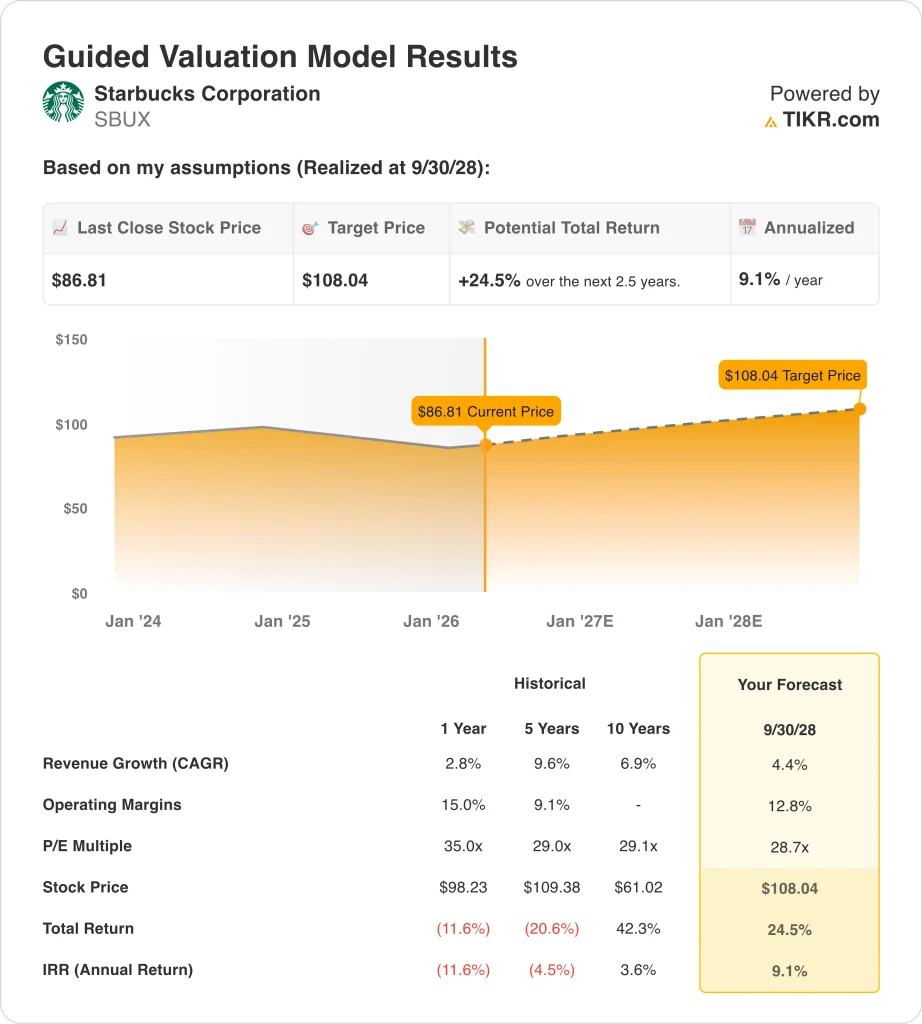 Value your favorite stocks like SBUX with 5 years of analysts’ forecasts using TIKR’s new Valuation Model (It’s free) >>>
