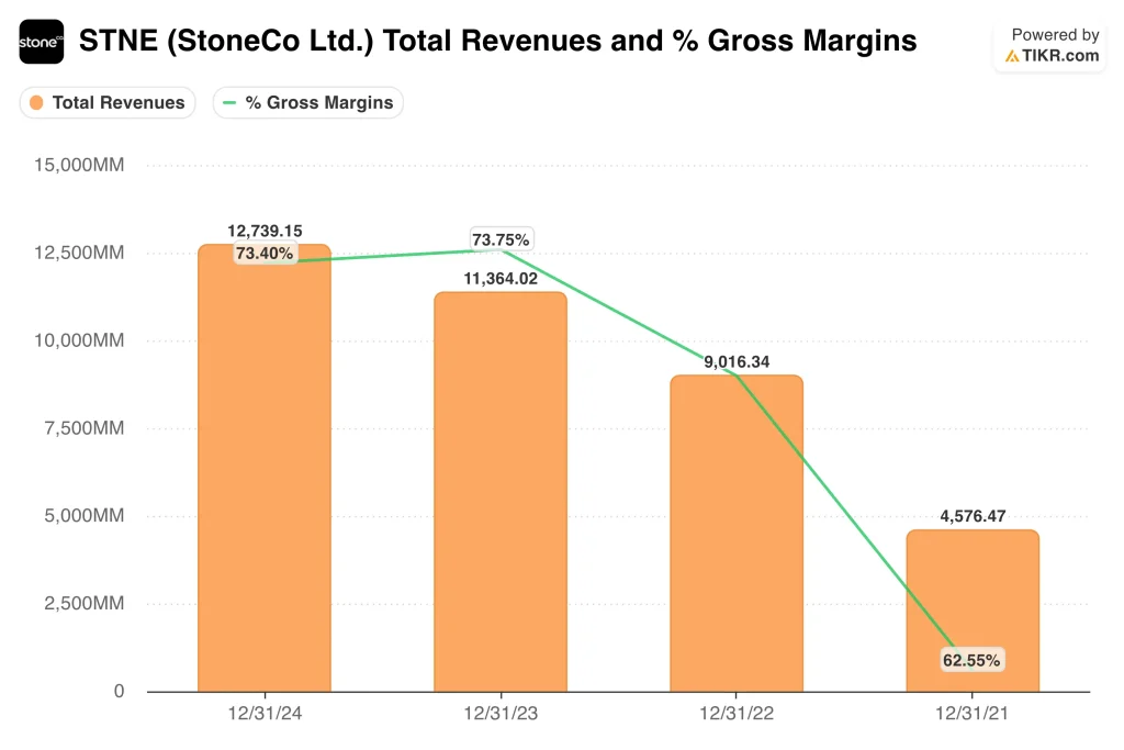 StoneCo’s business continues to generate strong profitability metrics. The company currently reports 73.6% gross margins and 46.2% EBIT margins, which are unusually high for a fintech platform serving small and mid-sized merchants.