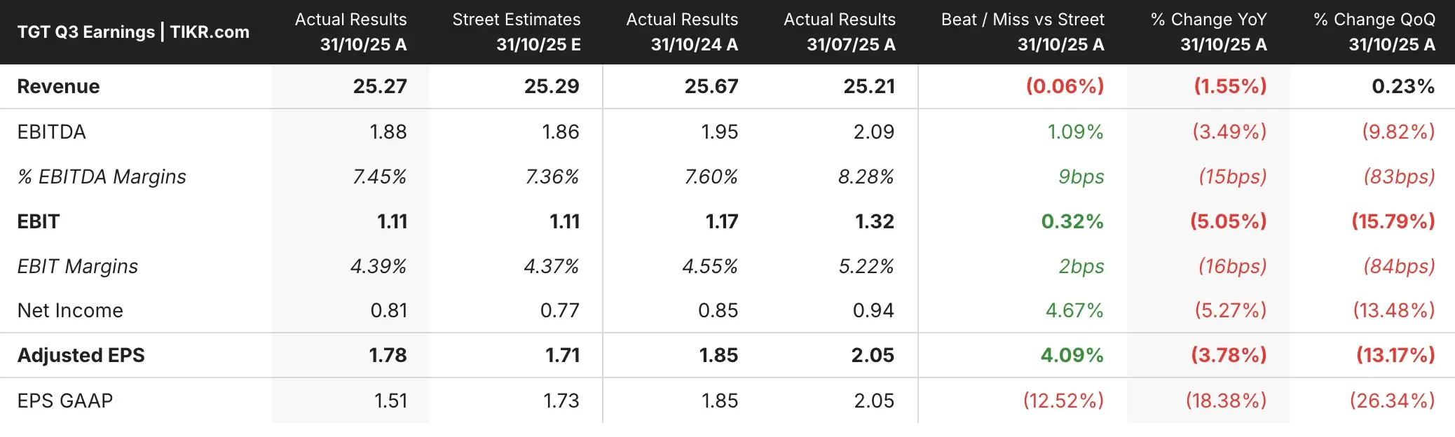 The company posted adjusted earnings of $1.78 per share on revenue of $25.27 billion, beating earnings estimates of $1.71 per share but missing revenue expectations of $25.29 billion.