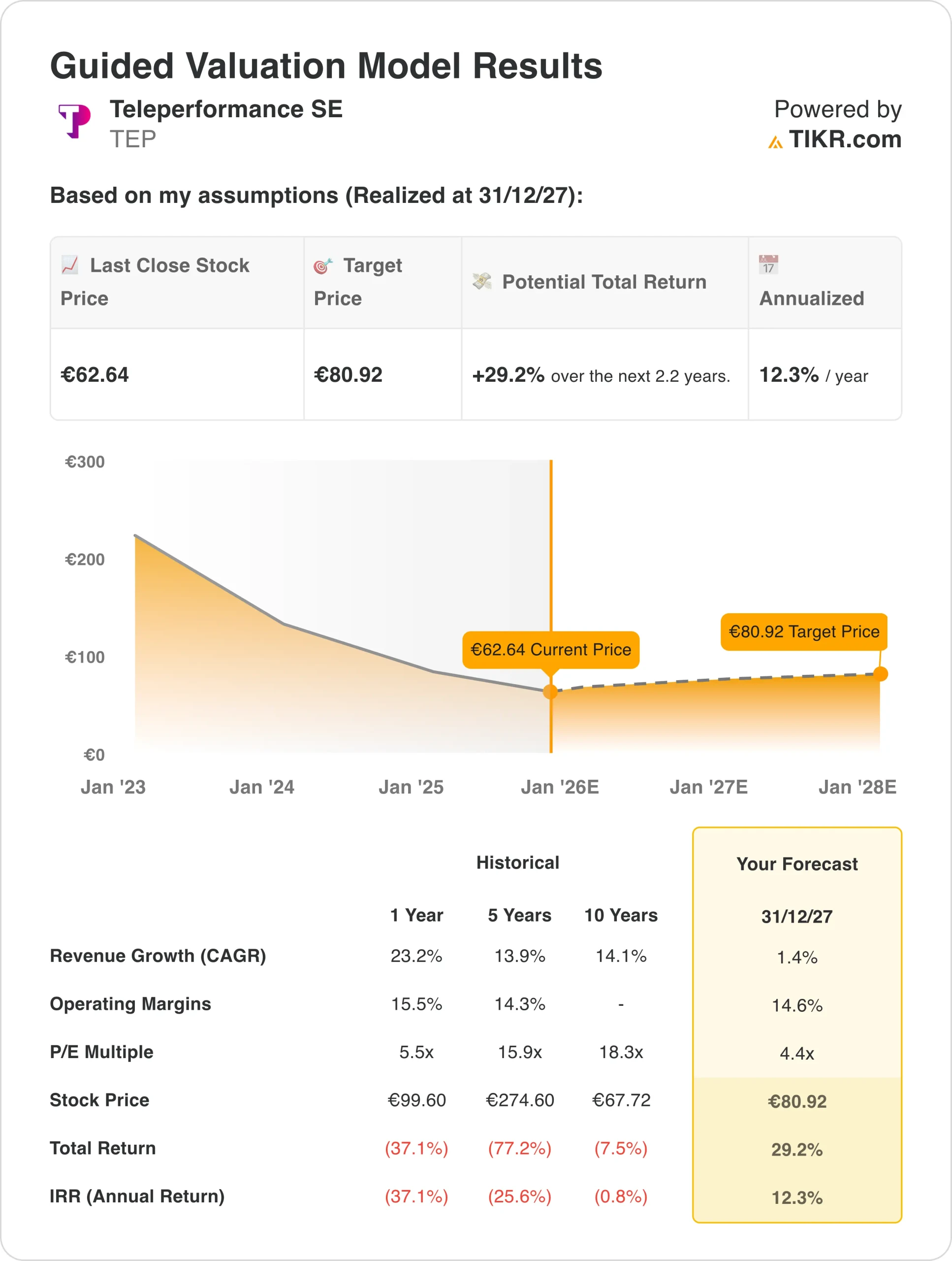 We analyzed the upside potential for Teleperformance stock using valuation assumptions based on AI-driven transformation capabilities and market positioning across customer experience management and adjacent high-growth services.