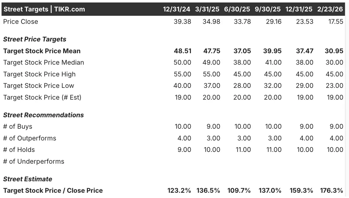 Targets have also trended down over the past year. The mean target moved from $48.51 at 12/31/24 to $30.95 at 2/23/26. That reset suggests analysts have moderated expectations.