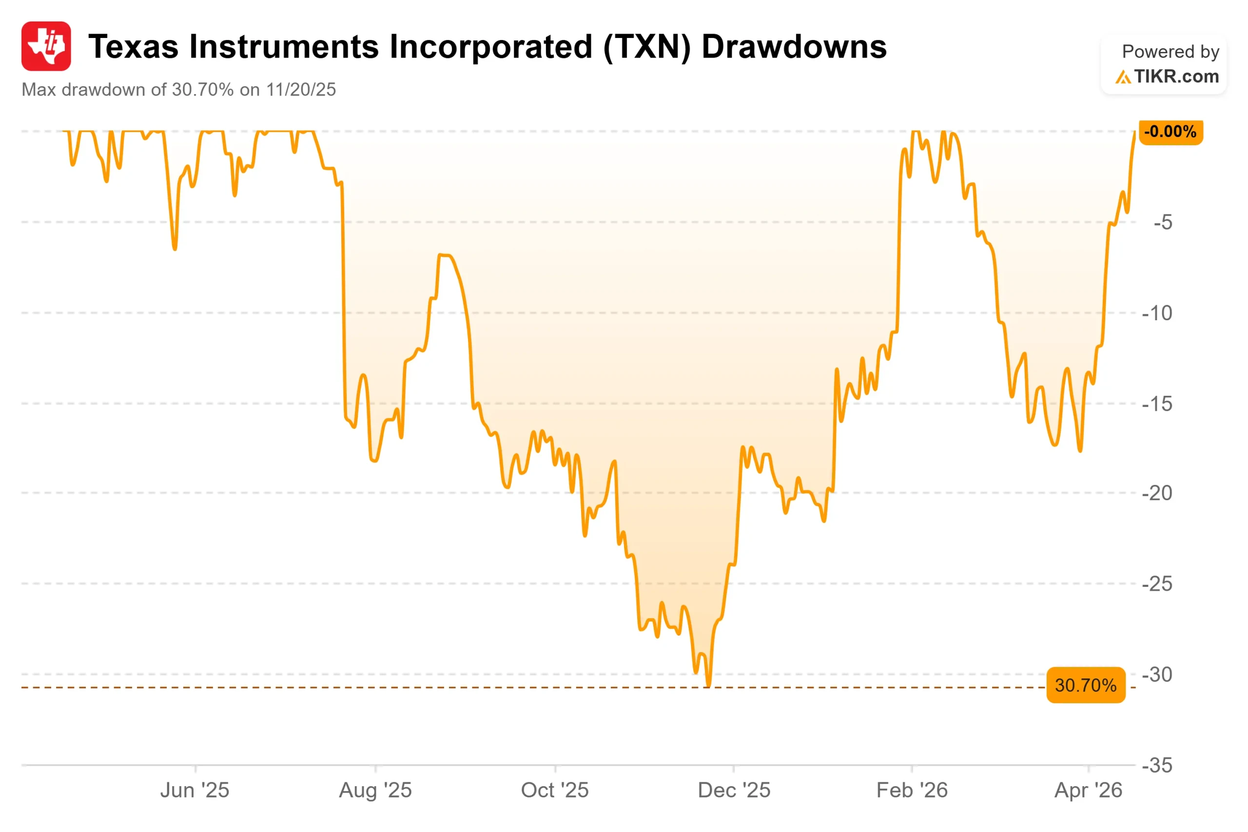 While Nvidia and AMD rallied on AI tailwinds, TXN ground lower as heavy fab construction spending compressed margins and free cash flow. The stock hit a max drawdown of 30.70% on November 20, 2025, its deepest pullback in years.