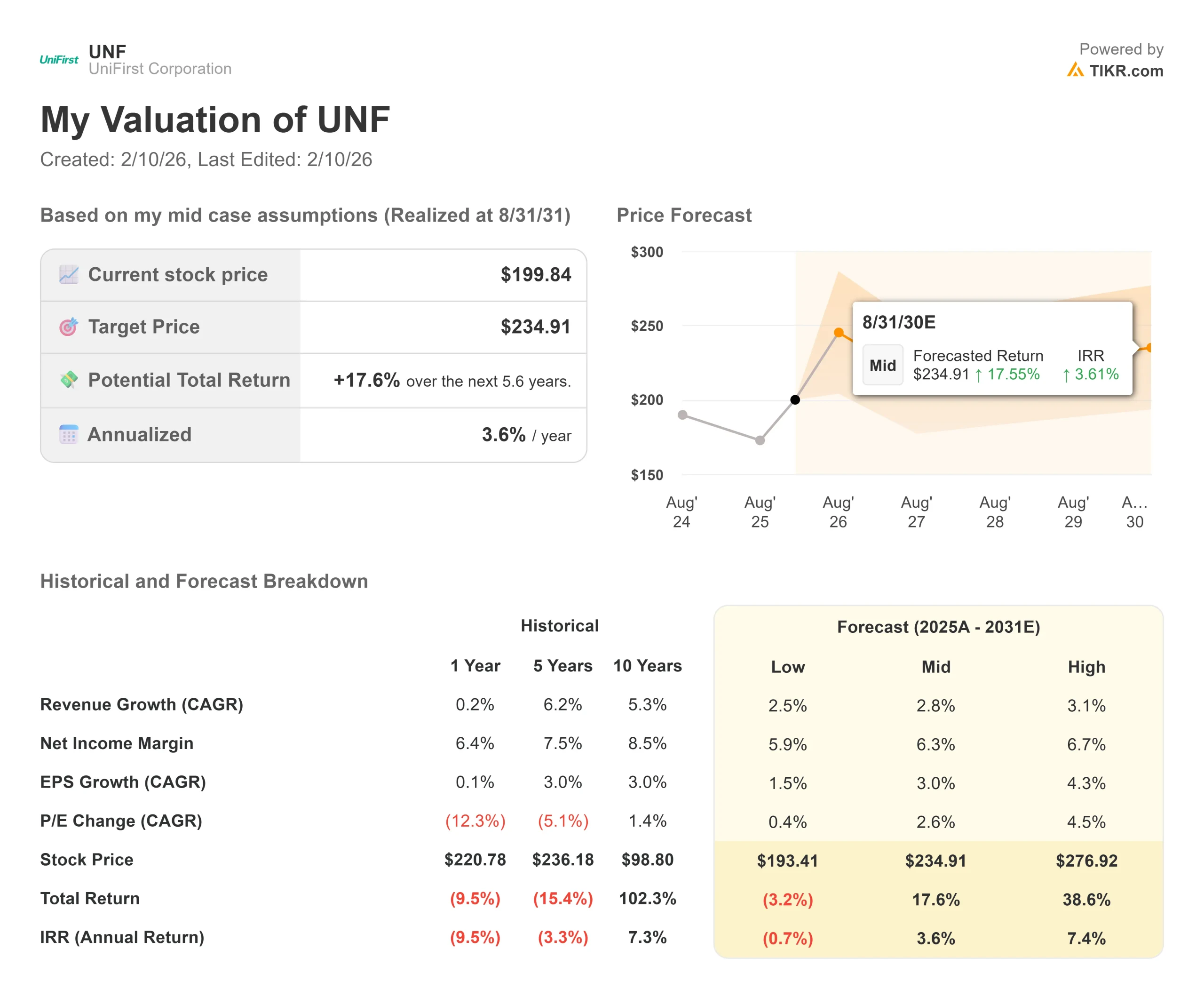 Conclusion: Dressed for success. With the stock hovering near its $235 fundamental value, UniFirst shareholders are poised to win either through a buyout premium or continued operational execution.