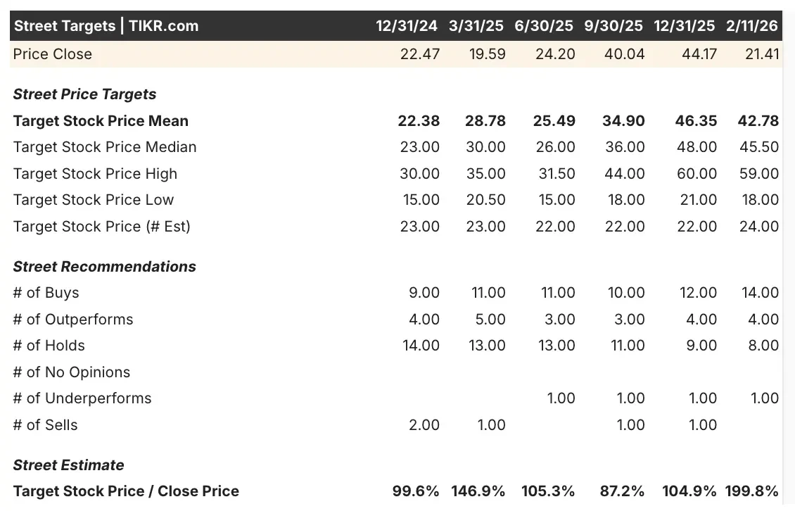 On the downside, the low price target is $18, highlighting ongoing execution risk. Street Targets data shows a target-to-price ratio of 200%, indicating wide dispersion in analyst expectations.