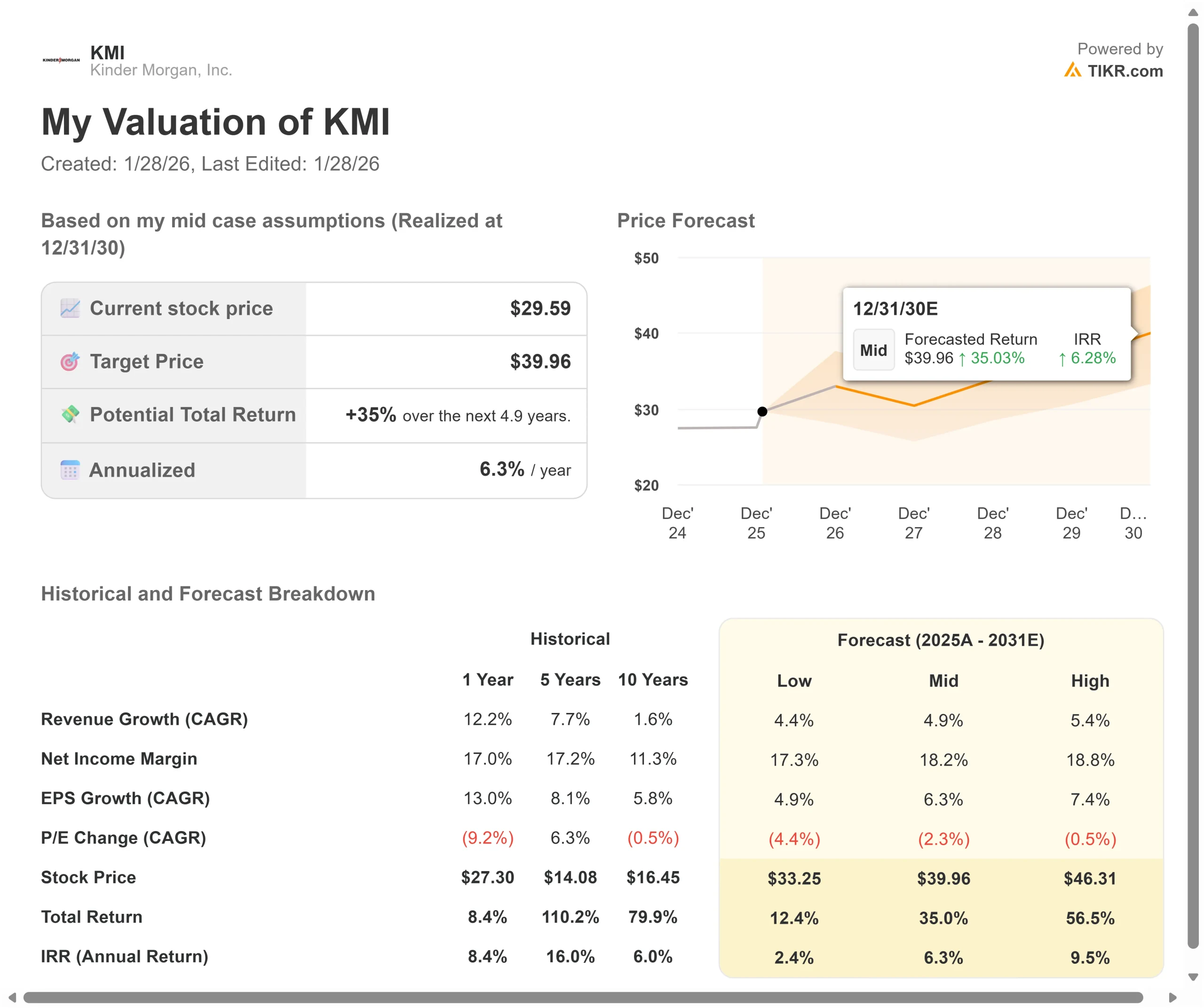 - Price Projection: Based on current execution, KMI stock could reach $35 by December 2028