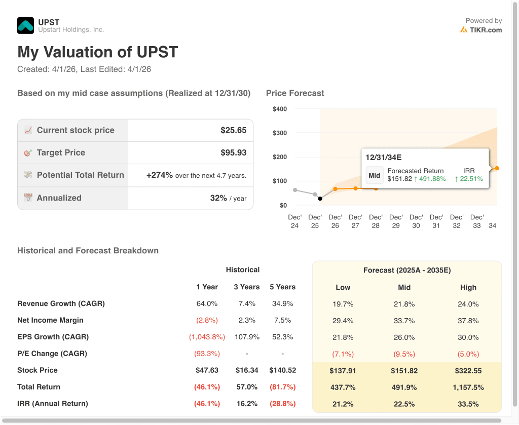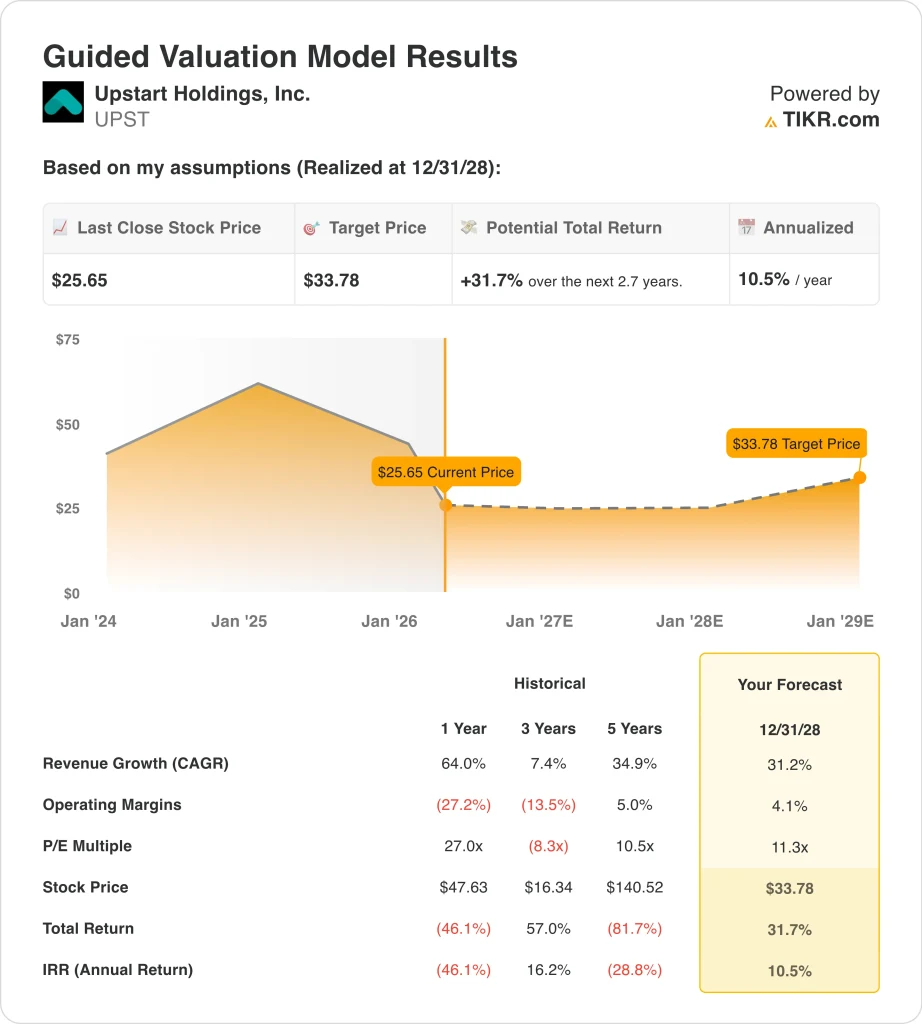 Based on estimates of 31.2% annual revenue growth, 4.1% operating margins, and a normalized P/E multiple of 11.3x, the model projects Upstart stock could rise from $26 to $34 per share.