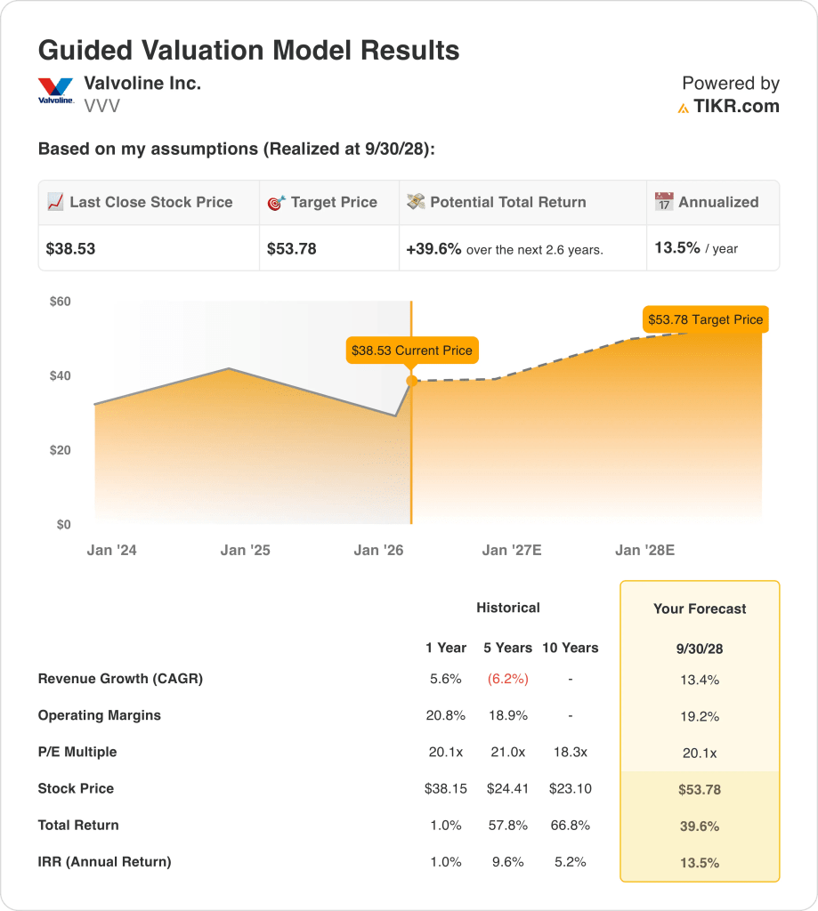 - Price Target Framework: Based on 13% revenue growth, 19% operating margins, and a 20x exit multiple, Valvoline Inc. stock could reach $54 by September 2028 from $39 today.