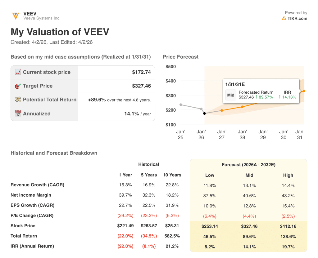 At $172.74, VEEV trades at approximately 19.6x FY2027E normalized EPS of $8.83, a steep discount to the 28x forward multiple the stock commanded just three months ago, even as the underlying business compounds EPS at a 22.5% five-year historical CAGR — VEEV stock is undervalued.
