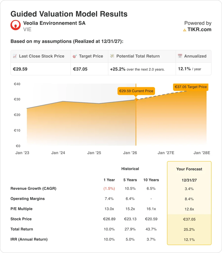 Based on estimates of 3.4% annual revenue growth, an operating margin of 8.4%, and an exit P/E multiple of 12.6x, the model suggests Veolia Environnement stock could rise from €29 to €37 per share by December 2027.