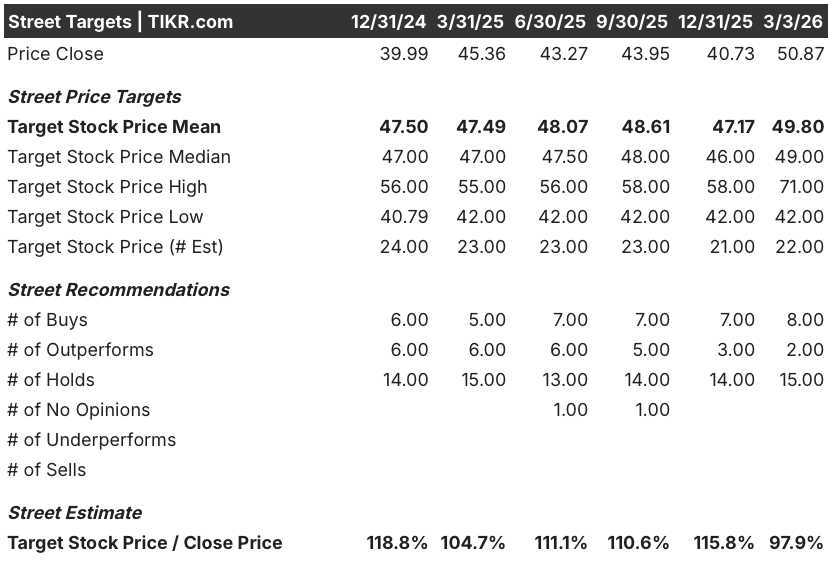 Wall Street carries 8 buys, 2 outperforms, and 15 holds as of March 3, with a mean price target of $49.80 implying the stock already trades roughly 2.1% above consensus, yet the high target of $71.00 signals significant upside believers remain.