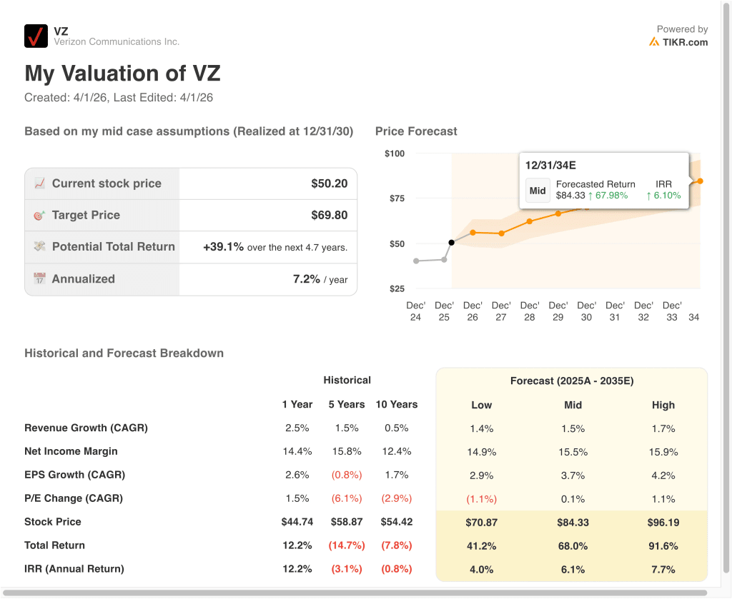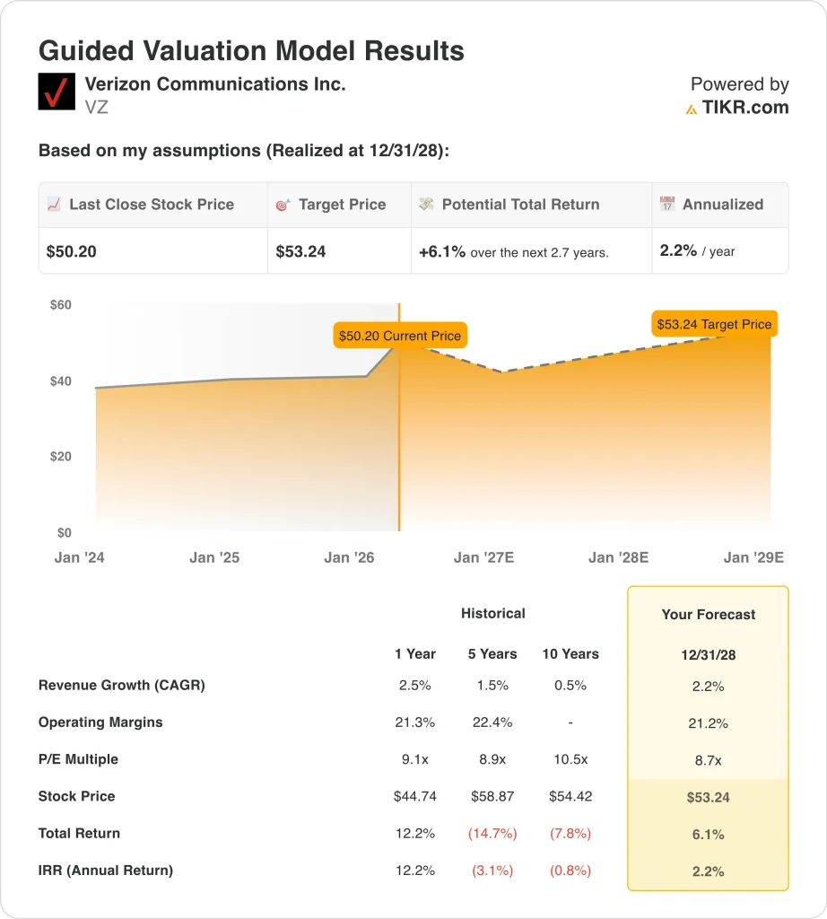 Verizon’s valuation is the clearest reason the model looks restrained. The guided valuation uses an 8.7x exit P/E multiple, which is below the stock’s 1-year, 5-year, and 10-year historical multiples shown in the model. That makes sense for a slower-growth telecom name, but it also means there is less room for multiple expansion to drive returns from today’s price.