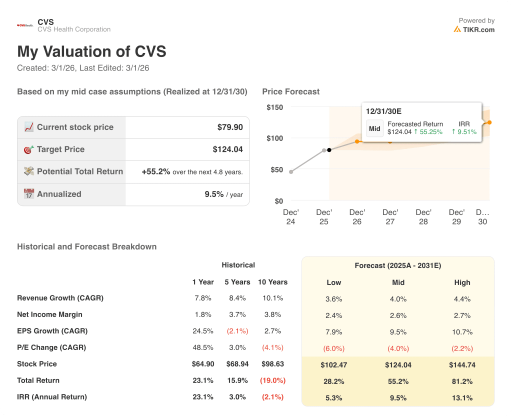 Pull up CVS stock and you’ll see years of historical financials, what Wall Street analysts expect for revenue and earnings in the quarters ahead, how valuation multiples have moved over time, and whether price targets are trending up or down.