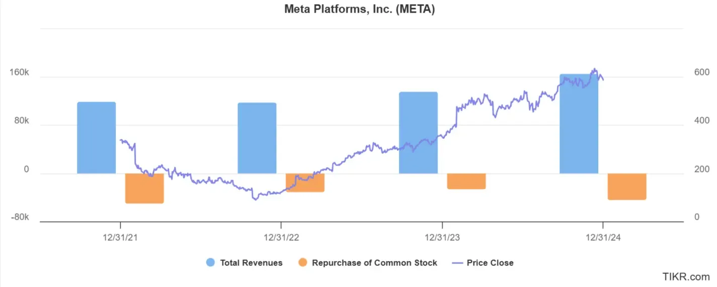 In 2022, Meta Platforms (META) launched a major share buyback program, repurchasing over $31 billion worth of stock while its stock price was low.