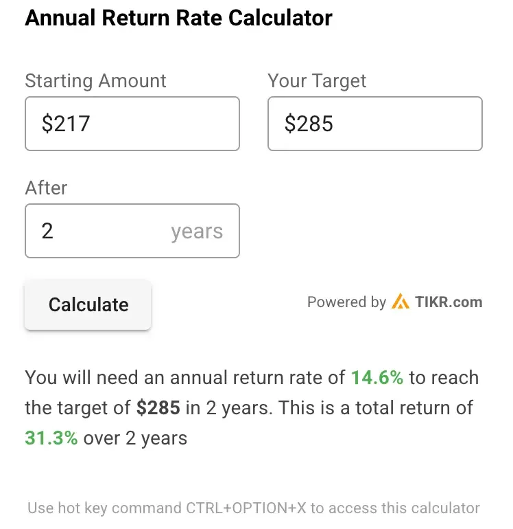 Expected Normalized EPS ($10.25) * Forward P/E ratio (27x) + Expected Dividends ($8) = Expected Share Price ($285)