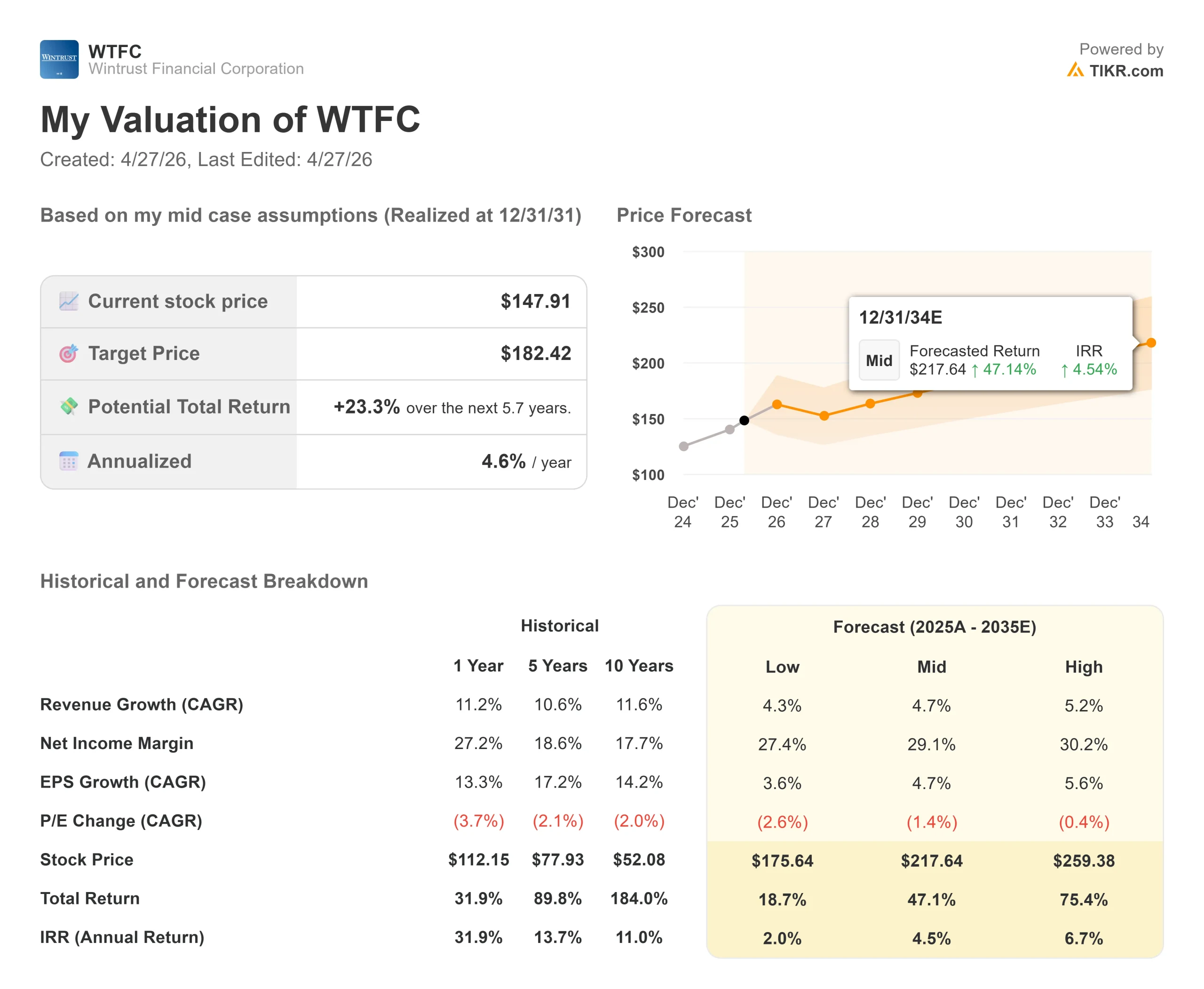 The TIKR mid-case model targets WTFC at around $182, implying around 23% total return from current levels, or roughly 5% annualized through 12/31/31. For a community bank trading at a reasonable multiple, that is a straightforward return profile.