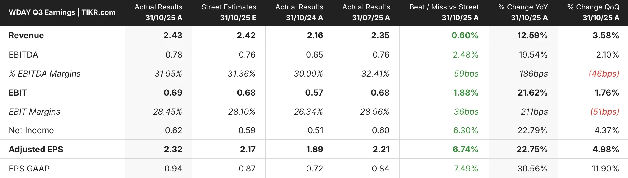 Workday reported adjusted earnings per share of $2.32, easily topping the expected $2.17. Revenue came in at $2.43 billion, just above the $2.42 billion consensus.