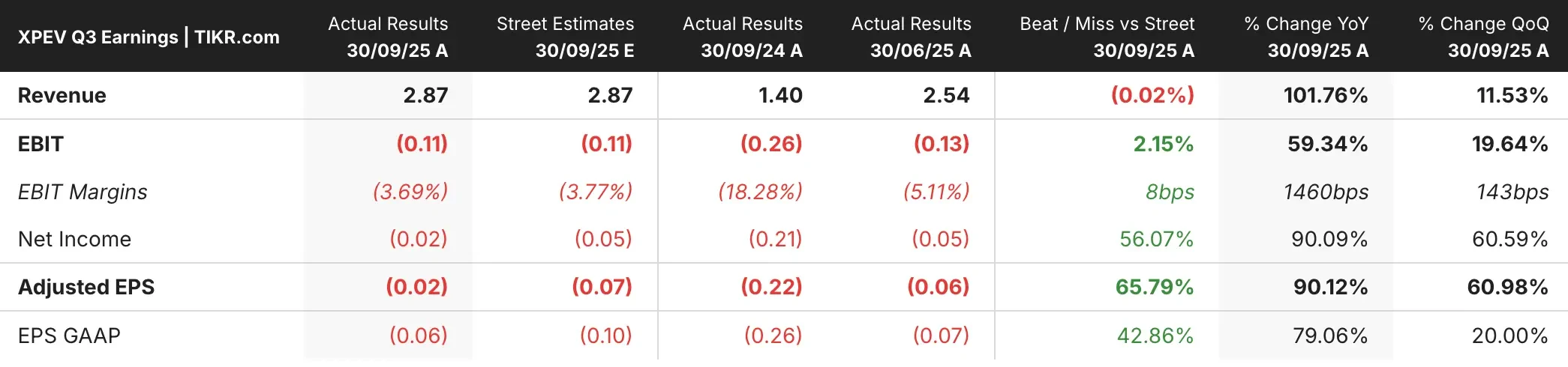 These future projects require significant capital, and the EV maker remains unprofitable. Xpeng reported a net loss of $53 million in Q3, though that improved from $253 million a year earlier. The company aims to achieve breakeven in the fourth quarter.