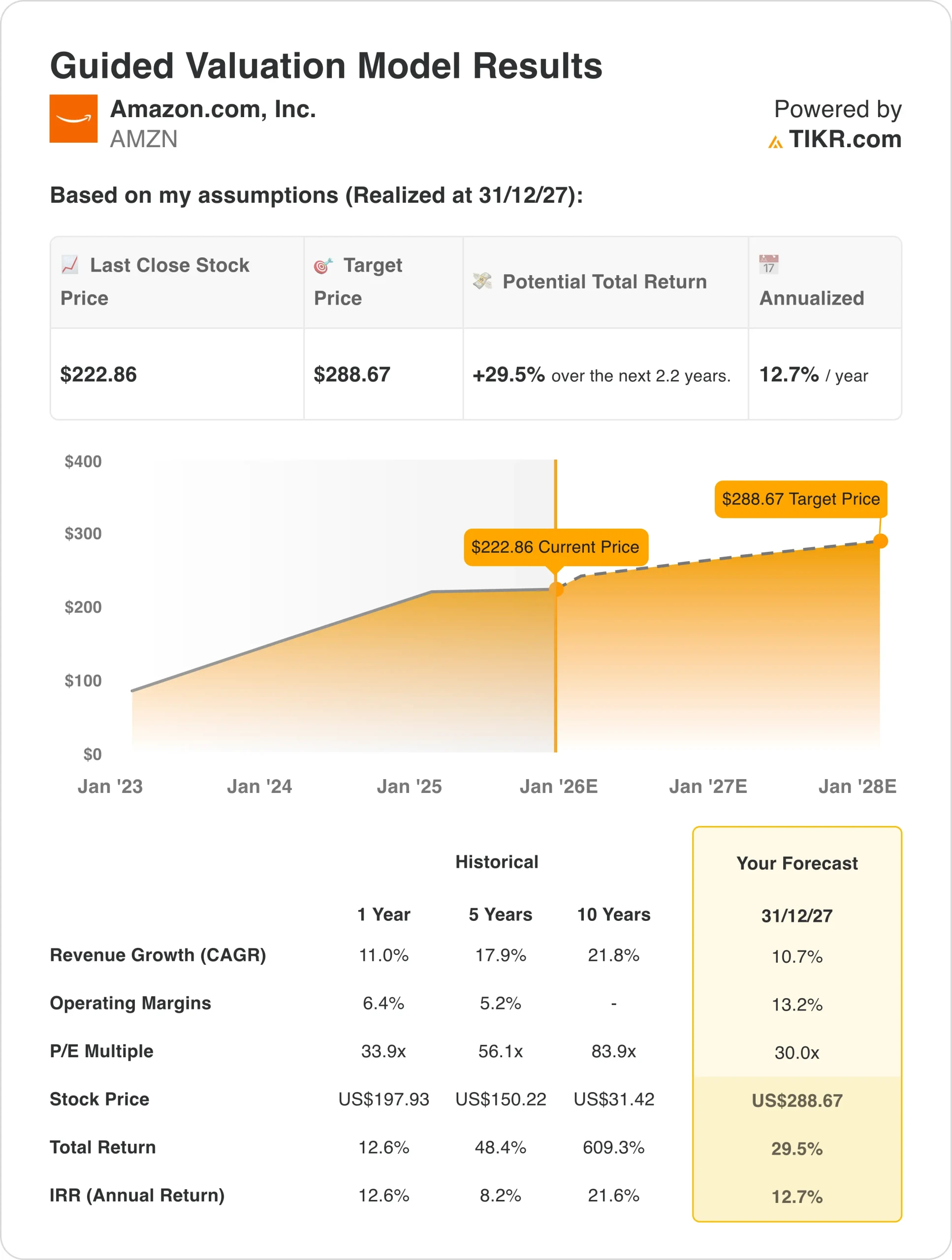 Von dort aus berechnet TIKR den potenziellen Aktienkurs und die Gesamtrendite in Bullen-, Basis- und Bären-Szenarien, damit Sie schnell erkennen können, ob eine Aktie unter- oder überbewertet erscheint.