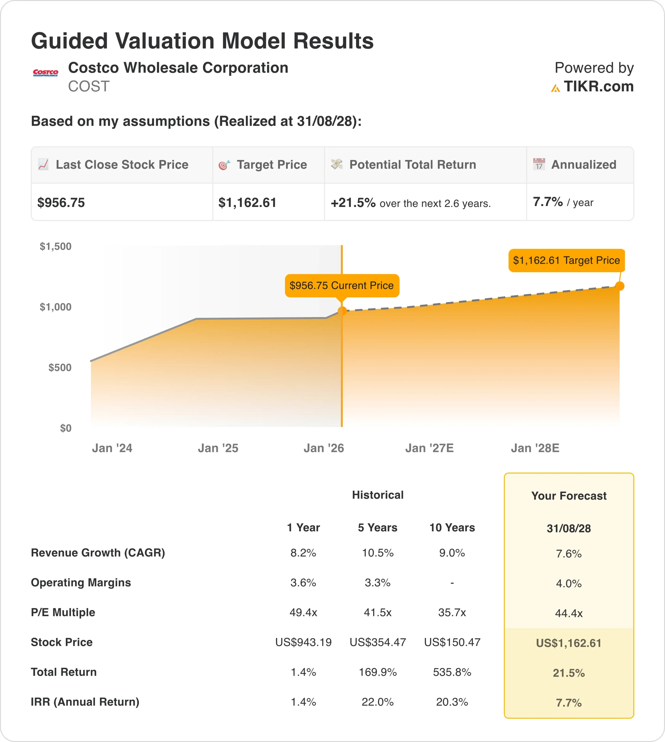 Von dort aus berechnet TIKR den potenziellen Aktienkurs und die Gesamtrendite in Bullen-, Basis- und Bären-Szenarien, damit Sie schnell erkennen können, ob eine Aktie unter- oder überbewertet erscheint.
