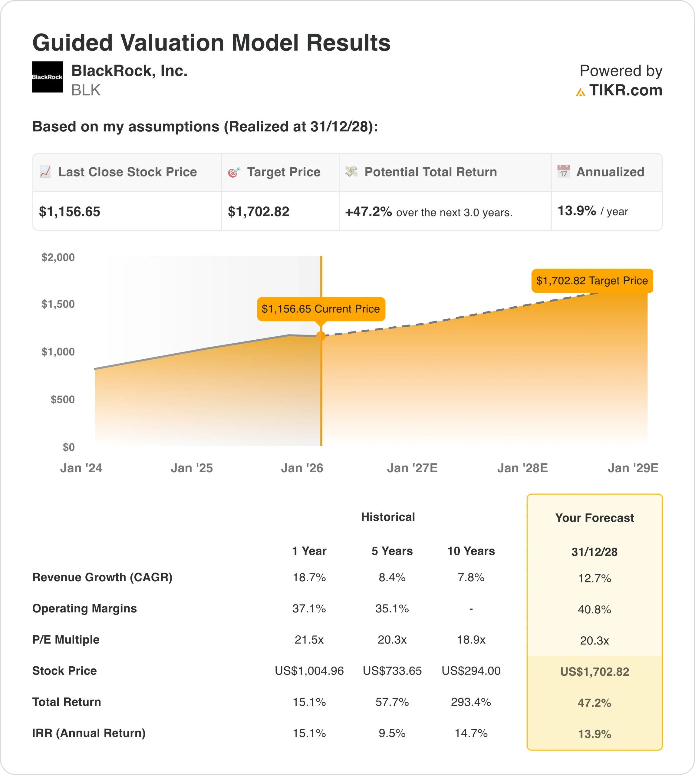 Das Management hat sich für das Jahr 2030 ehrgeizige Ziele gesetzt, darunter die Aufnahme von 400 Mrd. USD an den Privatmärkten und die Verdopplung des Betriebsergebnisses und der Marktkapitalisierung. Da die BlackRock-Aktie zu Beginn des Jahres 2026 mit um 13 % höheren Grundgebühren als im letzten Jahr gehandelt wird, hat das Unternehmen eine echte Dynamik hinter diesen Zielen.