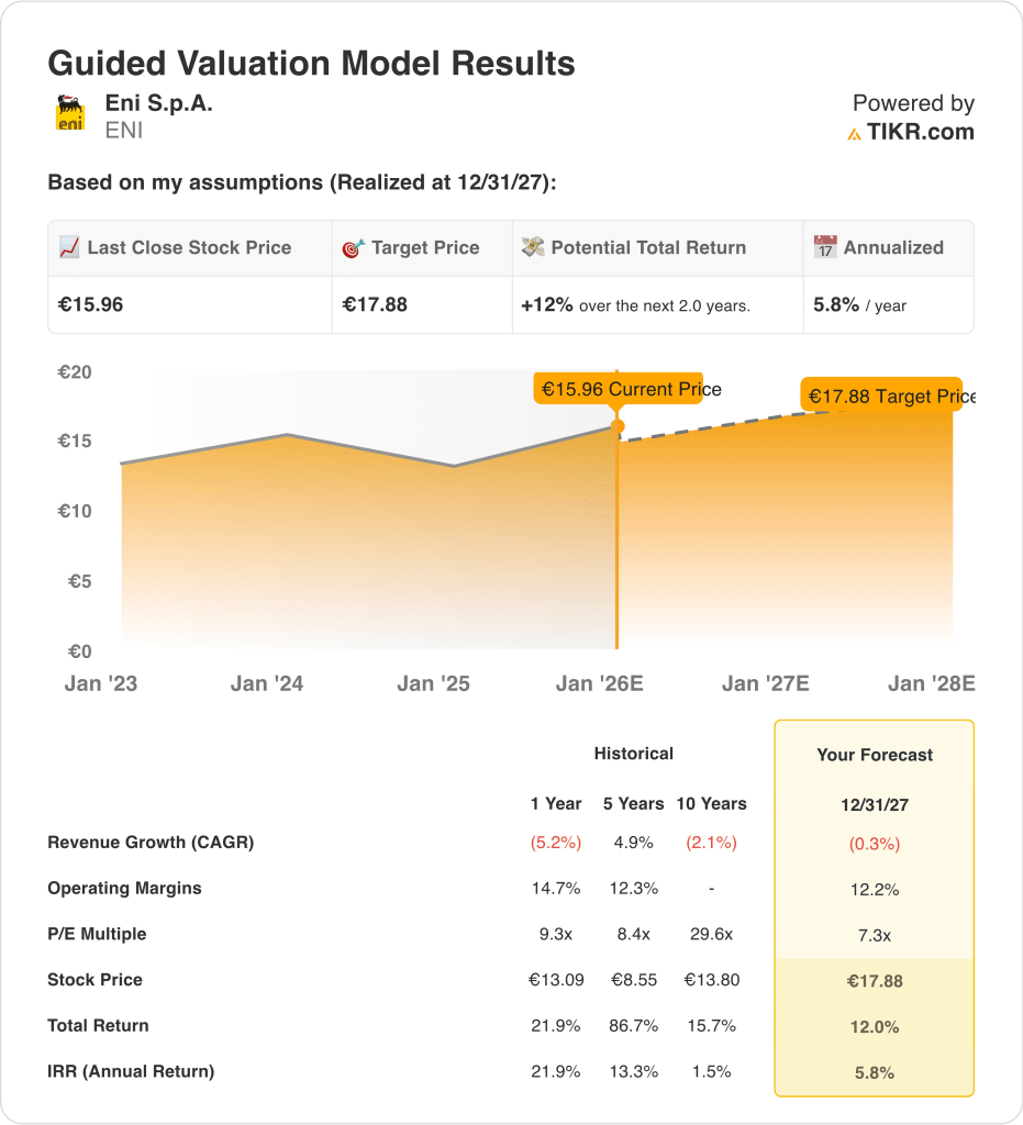 Unter der Annahme eines jährlichen Umsatzwachstums von 0,3 %, einer operativen Marge von 12,2 % und einem 7,3fachen Kurs-Gewinn-Verhältnis spiegelt das Modell eine ausgereifte Energiewirtschaft wider. Unter diesen Annahmen könnte die Eni-Aktie bis 2027 einen Wert von 18 € erreichen.