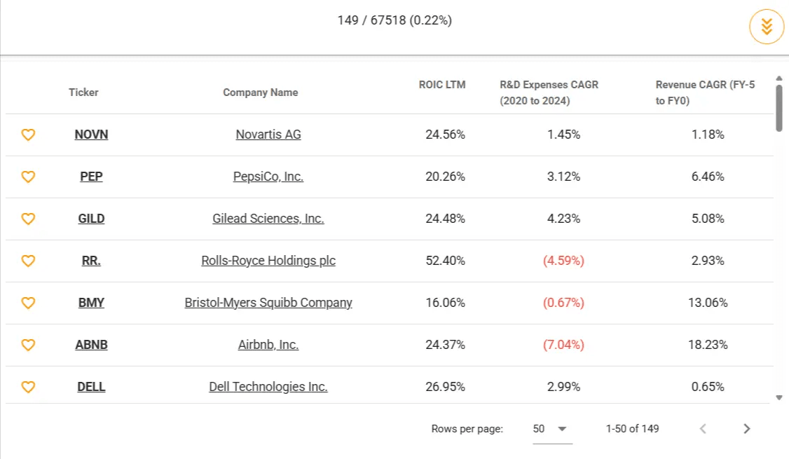 Dieses Screening hebt Unternehmen hervor, die mit ihren Kernprodukten hohe Renditen erwirtschaften und eine hohe Kapitalrendite (ROIC) mit einem geringen Wachstum bei Forschung und Entwicklung kombinieren.