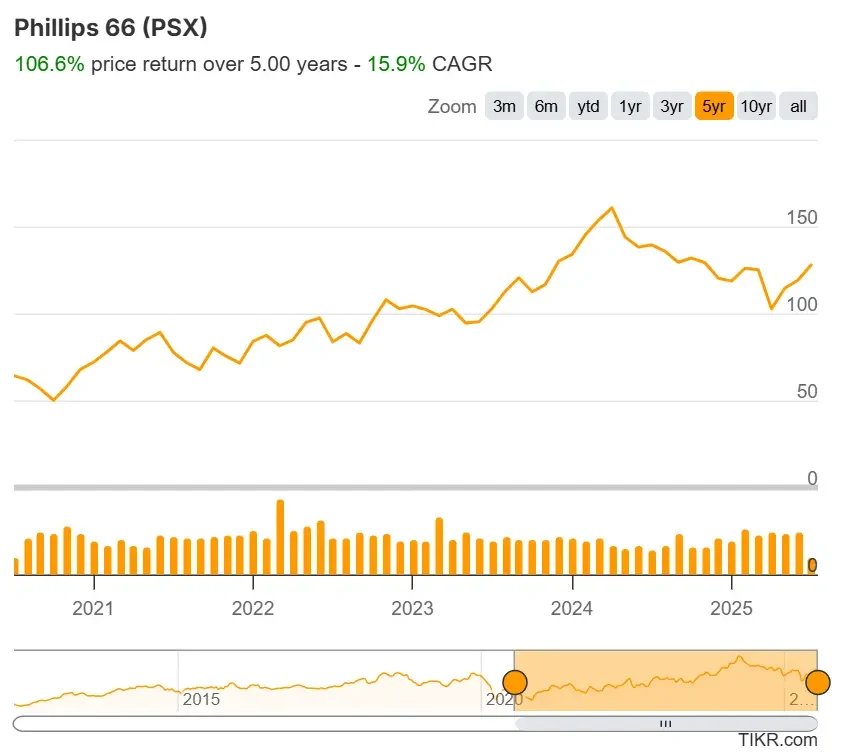 Phillips 66 ist ein großes US-amerikanisches Energieunternehmen, das Öl raffiniert, Treibstoff transportiert, Tankstellen beliefert und deren Markenzeichen besitzt sowie Chemikalien herstellt. Das Unternehmen verfügt über eine solide Infrastruktur, erwirtschaftet einen starken Cashflow und neigt dazu, seine Aktionäre durch Rückkäufe und Dividenden zu belohnen.