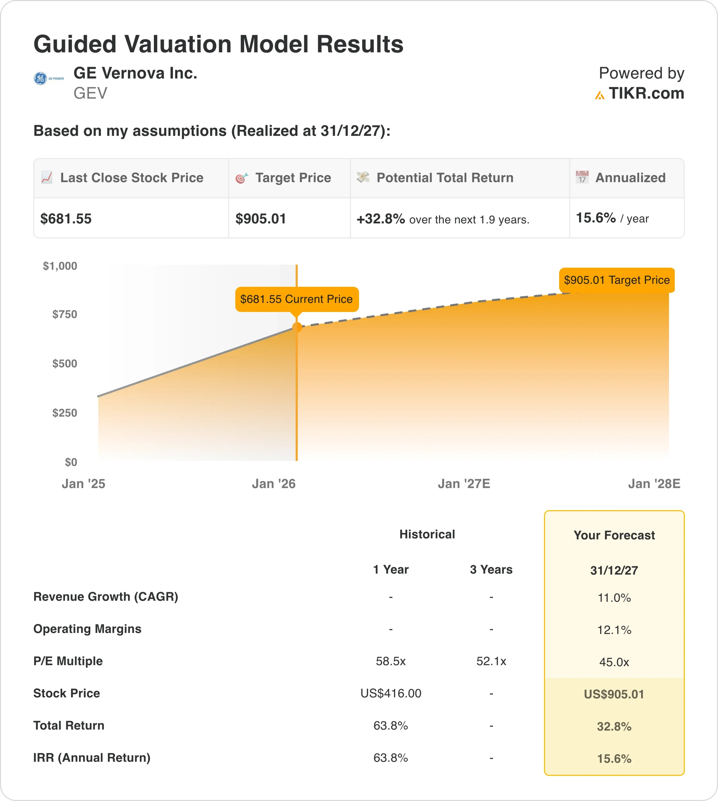 Von dort aus berechnet TIKR den potenziellen Aktienkurs und die Gesamtrendite in Bullen-, Basis- und Bären-Szenarien, damit Sie schnell erkennen können, ob eine Aktie unter- oder überbewertet erscheint.