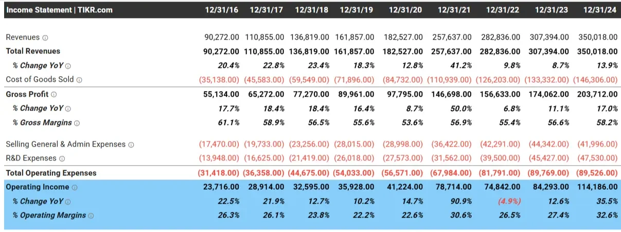 Wenn Sie sich die nachstehende Gewinn- und Verlustrechnung von Google ansehen, werden Sie feststellen, dass die Einnahmen des Unternehmens in den letzten Jahren um weniger als 10 % pro Jahr gestiegen sind: