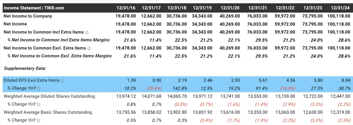 Sie können sehen, dass das EPS von Google in den letzten Jahren stetig gewachsen ist: