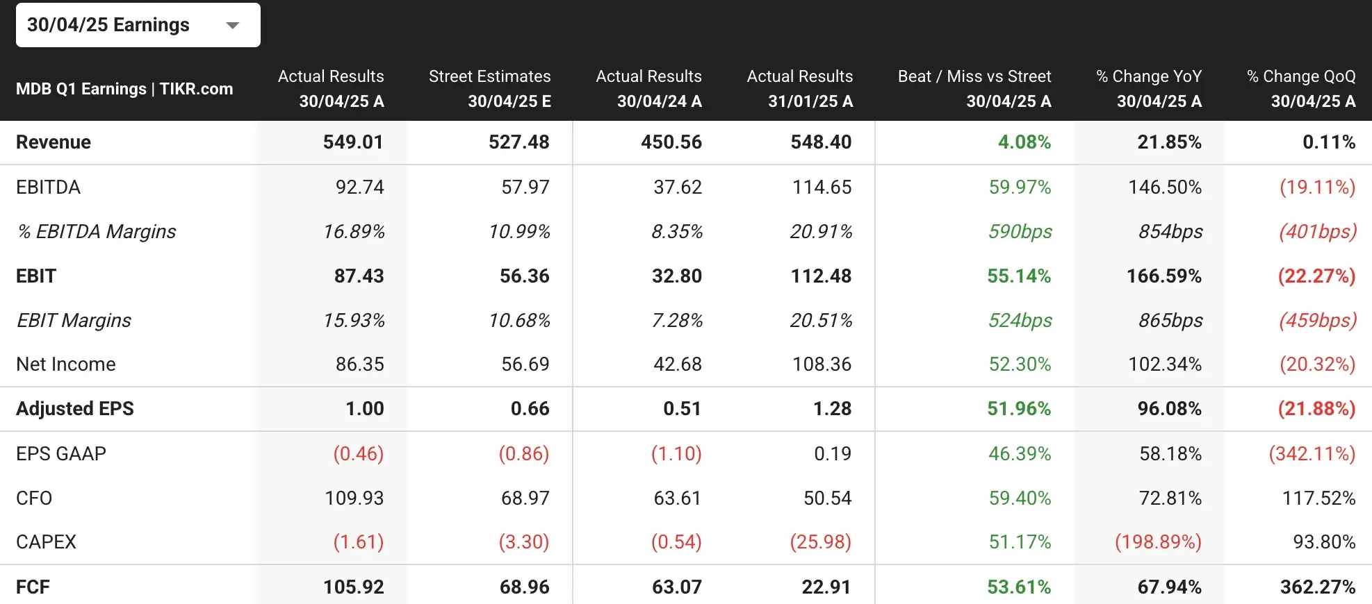 Die Aktien von MongoDB(MDB) steigen, nachdem das Datenbanksoftwareunternehmen einen hervorragenden Gewinnbericht für das erste Quartal des Geschäftsjahres 2026 vorgelegt hat.