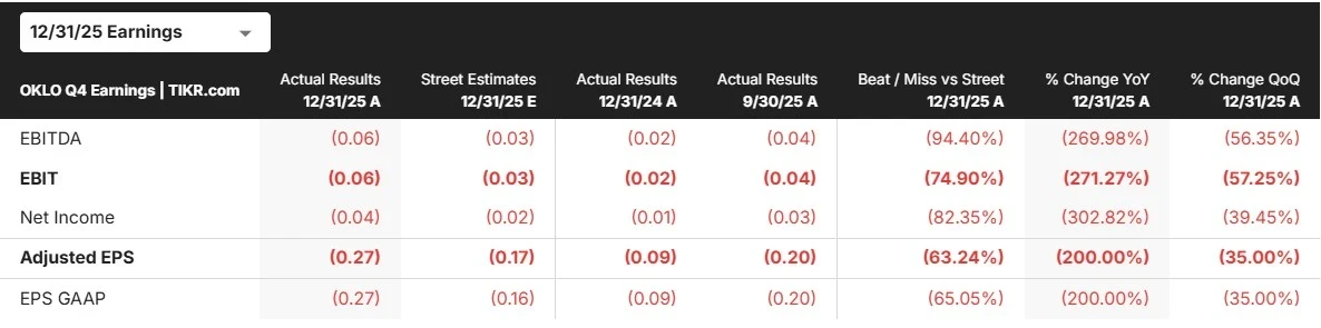 Die Aktien vonOklo(OKLO) fielen, nachdem das Unternehmen seine Finanzergebnisse für das Jahr 2025 bekannt gab, die einen Verlust von 139,3 Millionen Dollar aus dem operativen Geschäft auswiesen. Diese Zahl wurde durch Lohnkosten, Geschäftsausgaben und Honorare sowie 41,8 Millionen Dollar an nicht zahlungswirksamer Aktienvergütung verursacht.