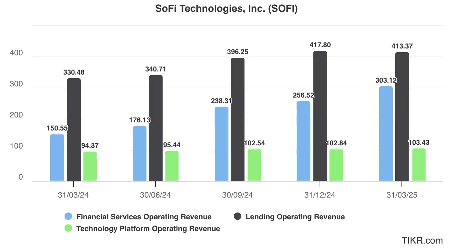SoFi Technologies(SOFI) wird mit einer Marktkapitalisierung von 14,7 Milliarden US-Dollar bewertet und ist als umfassende digitale Finanzdienstleistungsplattform in drei Segmenten tätig: Kreditvergabe, Technologieplattform und Finanzdienstleistungen.