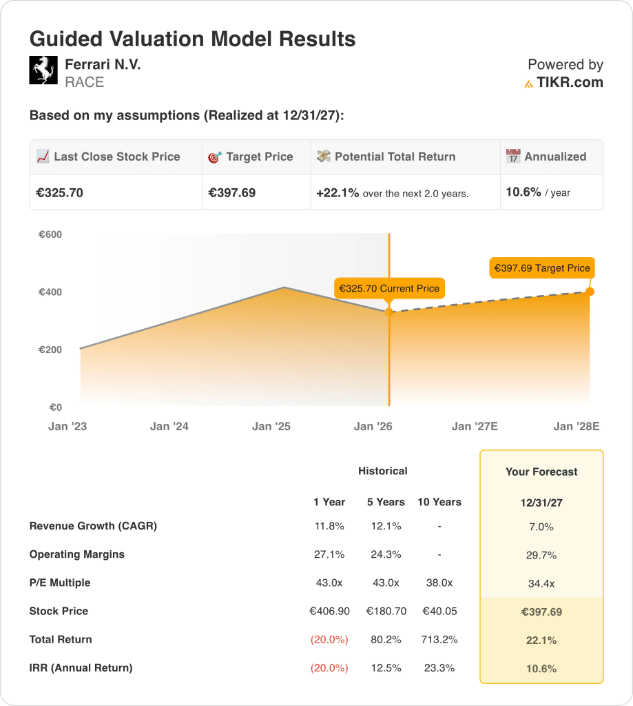Ein Exit-Multiplikator von 34,4× spiegelt die Markterwartung wider, dass die Premium-Bewertung von Ferrari bestehen bleibt, während gleichzeitig ein langsameres Wachstum im Vergleich zu früheren Expansionsphasen anerkannt wird.