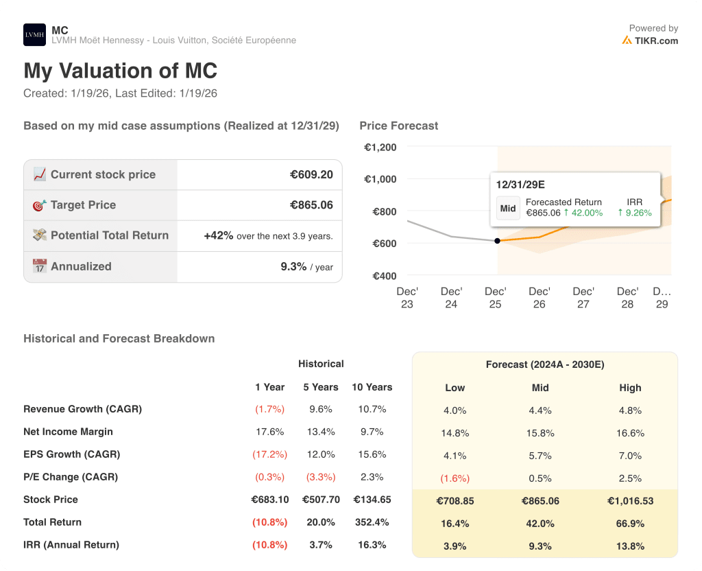 - Margenprofil: LVMH weist im Modell eine operative Marge von 23% auf, gegenüber 27% in der 1-Jahres-Historie, was zeigt, dass Rentabilitätsdruck wichtiger ist als Volumenwachstum.