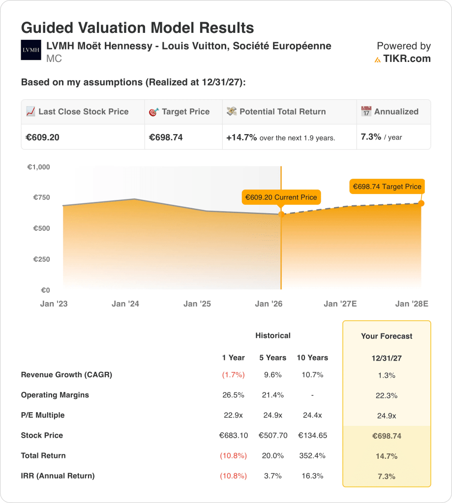 Unter Zugrundelegung eines Umsatzwachstums von 1,3 %, einer operativen Marge von 22,3 % und eines 24,9-fachen Kurs-Gewinn-Verhältnisses pro Aktie projiziert das Modell LVMH auf 698,74 Euro pro Aktie.
