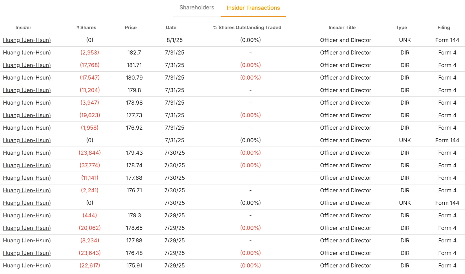 Nvidia-CEO Jensen Huang verkaufte an drei Tagen, vom 28. bis 30. Juli 2025, mehr als 200.000 Aktien zu Preisen zwischen 175,91 und 182,70 US-Dollar. Die einzelnen Transaktionen reichten von einigen tausend Aktien bis zu über 37.000 Aktien in einem einzigen Handel.