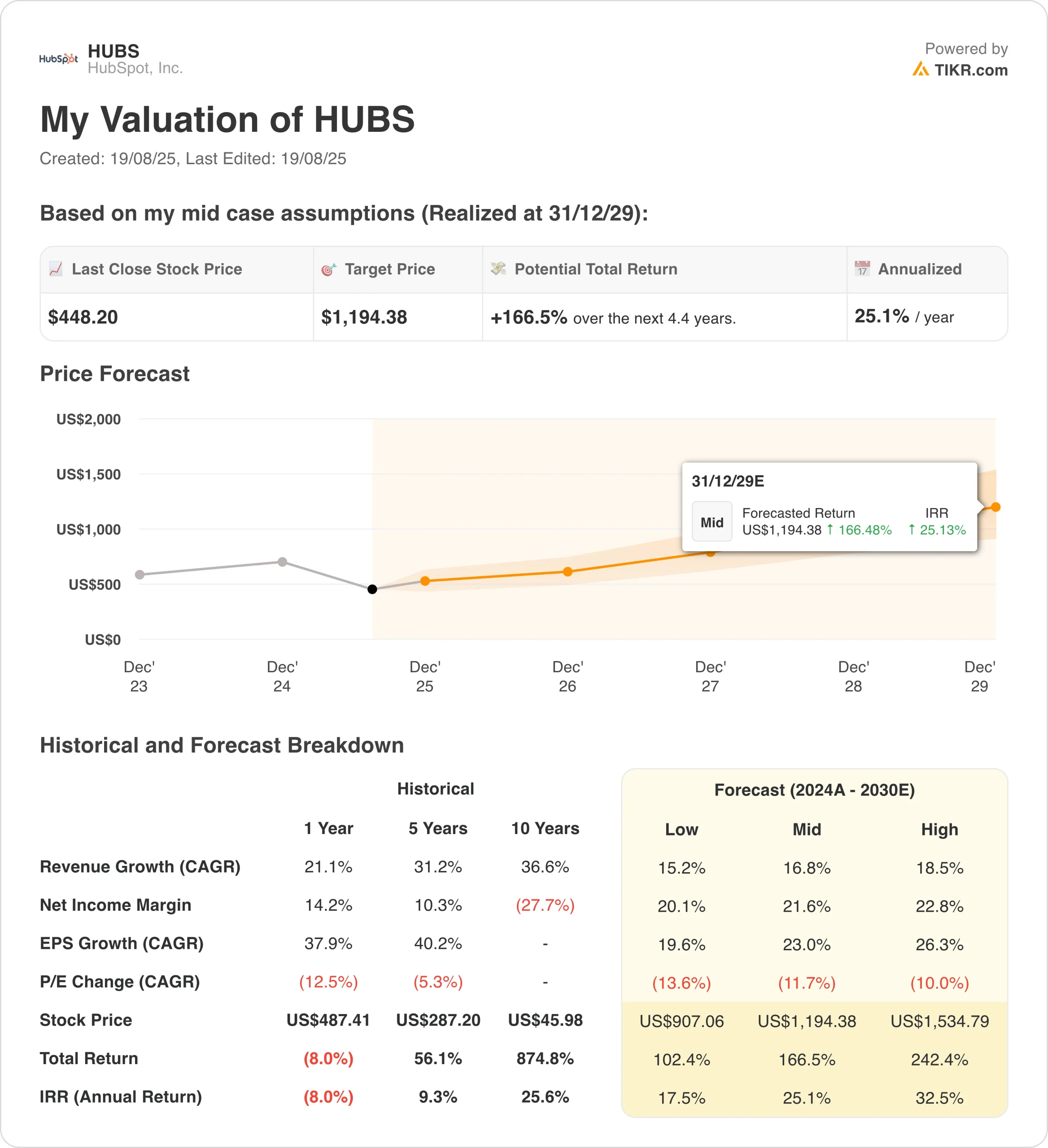 Sobre la base de unas estimaciones de crecimiento anual de los ingresos del 17%, unos márgenes operativos del 20% y un múltiplo de valoración P/E normalizado de 42x, el modelo proyecta que las acciones de HUBS podrían subir de 448 $/acción a 706 $/acción.