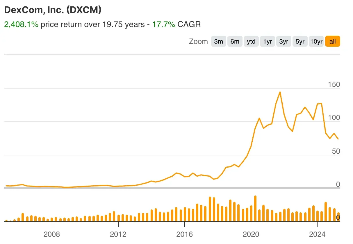 Las acciones de DXCM salieron a bolsa en abril de 2005 y han reportado a sus accionistas un 2.400% en las dos últimas décadas, lo que supone una tasa de crecimiento anual compuesto de casi el 18%. A pesar de estas enormes ganancias, el valor sanitario se encuentra casi un 47% por debajo de sus máximos históricos, lo que le permite aprovechar la caída.