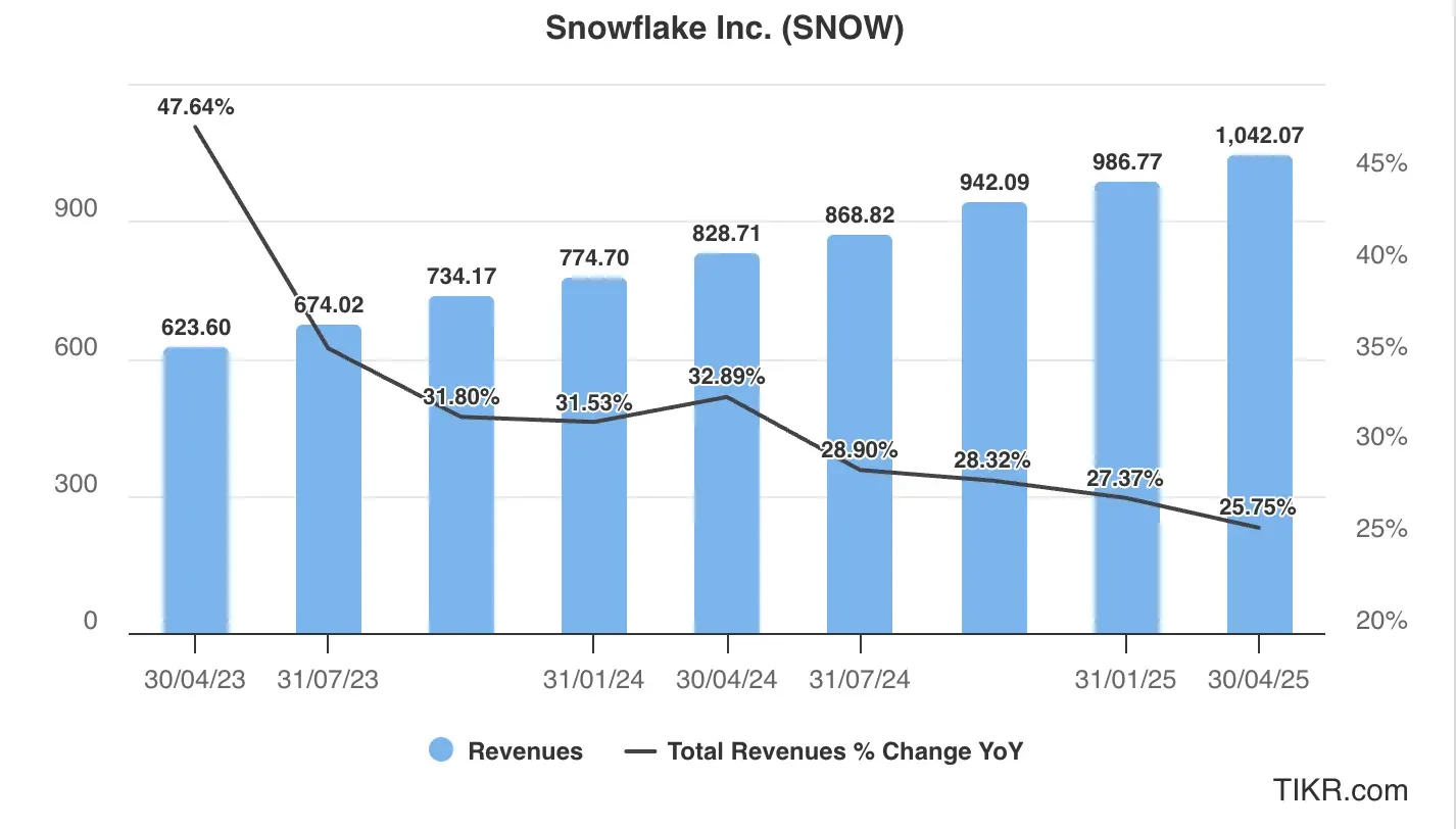 - Snowflake registró unos ingresos por productos de 997 millones de dólares en el primer trimestre, lo que representa un crecimiento interanual del 26% y un comportamiento estable trimestre tras trimestre.
