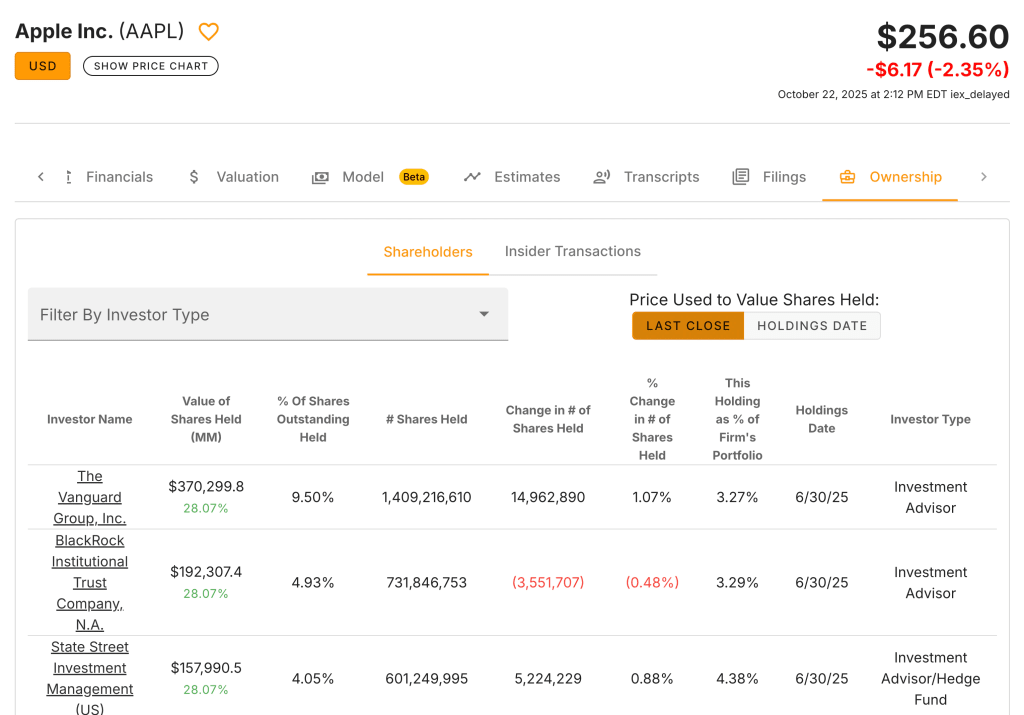 Sus desgloses de propiedad distinguen entre fondos de inversión, fondos de cobertura, pensiones y otras entidades, lo que le da una idea de qué tipos de inversores dominan una acción. También puede seguir los cambios en el tamaño de las posiciones y ver la rotación trimestral, una forma infravalorada de medir si las instituciones son tenedores a largo plazo o comerciantes a corto plazo.