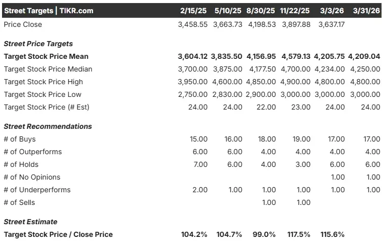 El precio objetivo de consenso de Street de 4.209,04 dólares representa una atractiva rentabilidad potencial del 15,7% desde los 3.637,17 dólares actuales.